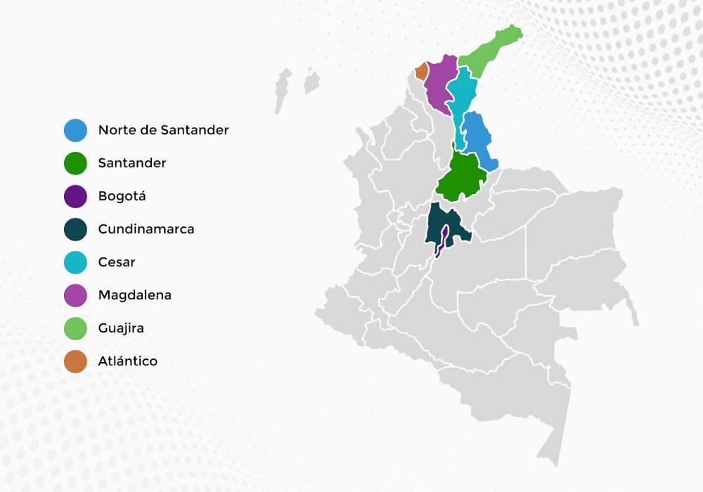 Con presencia en 8 departamentos: Santander, N. de Santander, Bogotá, Cundinamarca, Cesar, Magdalena, Guajira y Atlántico.